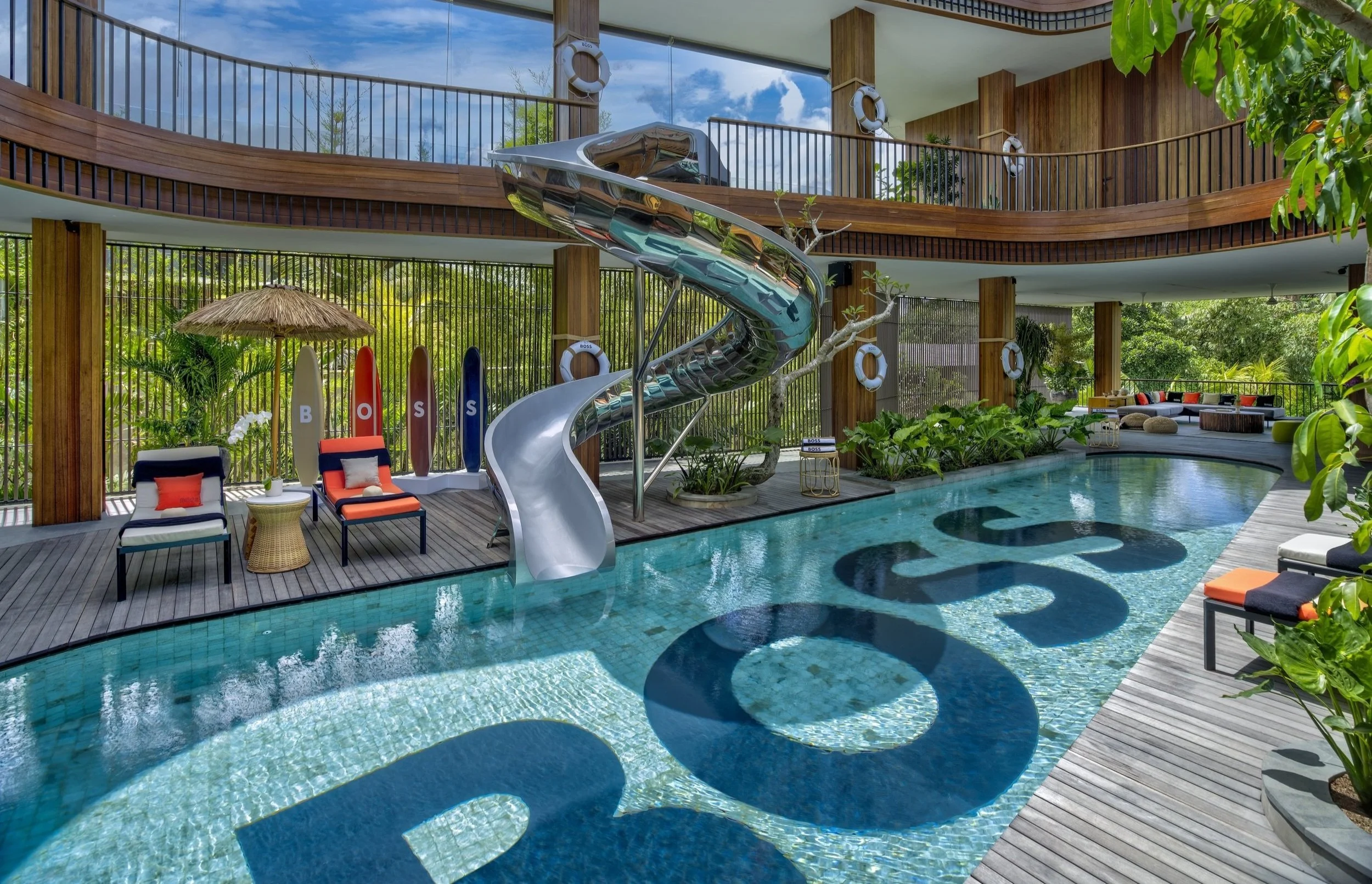 The anticipation builds as you enter the villa. A grand entrance leads to a spacious dining room, before the floor-to-ceiling glass doors lead to the big reveal: a vast atrium that opens up to the sky and sunshine. From here, you see the villa’s stunning statement piece: a gleaming sculptural waterslide that swoops into the 17m-long swimming pool. Sunbeds and a roofed lounge area provide inviting spots for relaxation and cocktails. It’s designed for the ultimate pool party—make moves like Jagger and have a splashing good time.